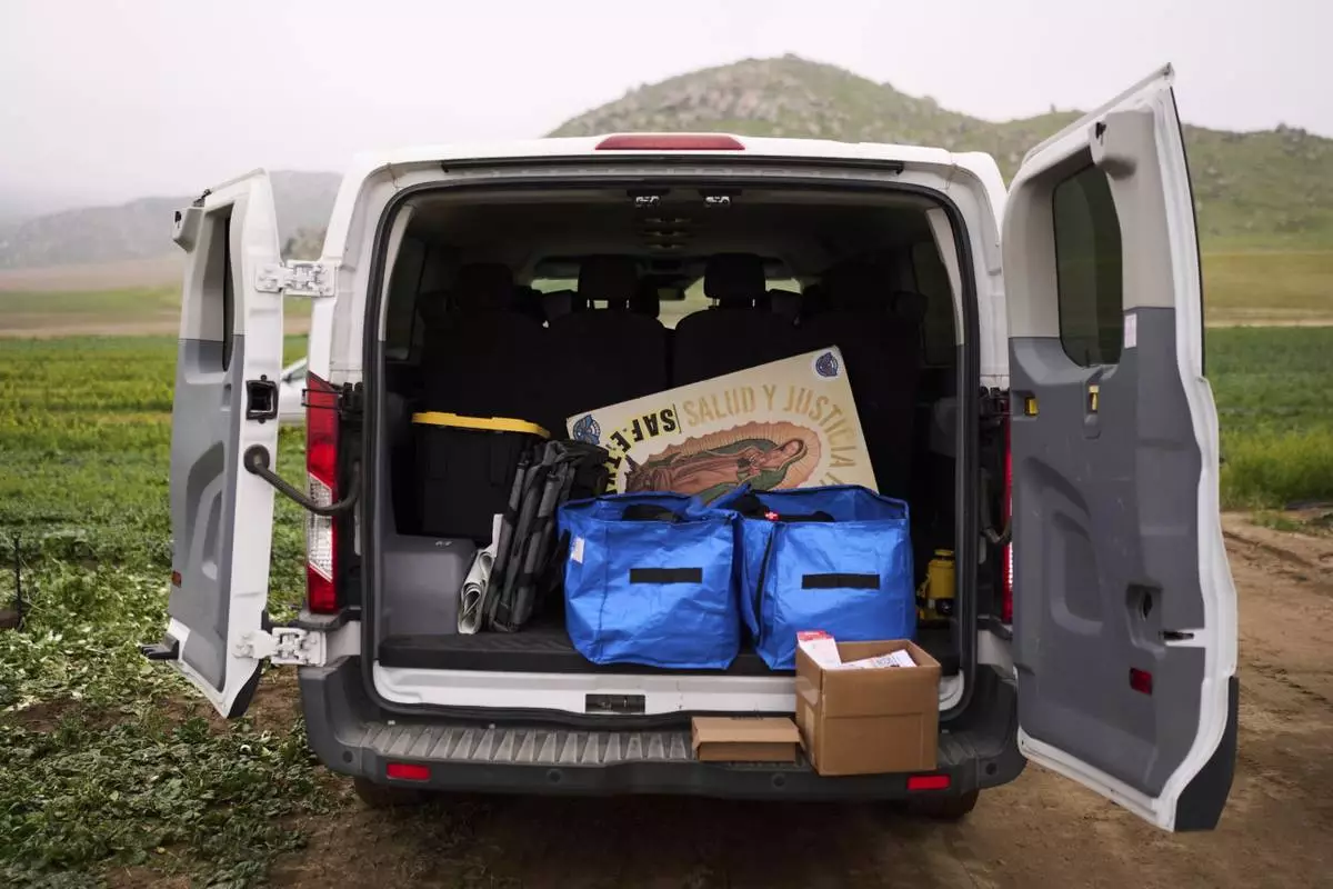 A van belonging to the immigrant and farmworker justice group TODEC is loaded with supplies, including a sign featuring Our Lady of Guadalupe, during a Know Your Rights session in a farm field in Lakeview, Calif., Tuesday, April 15, 2025. (AP Photo/Jae C. Hong)