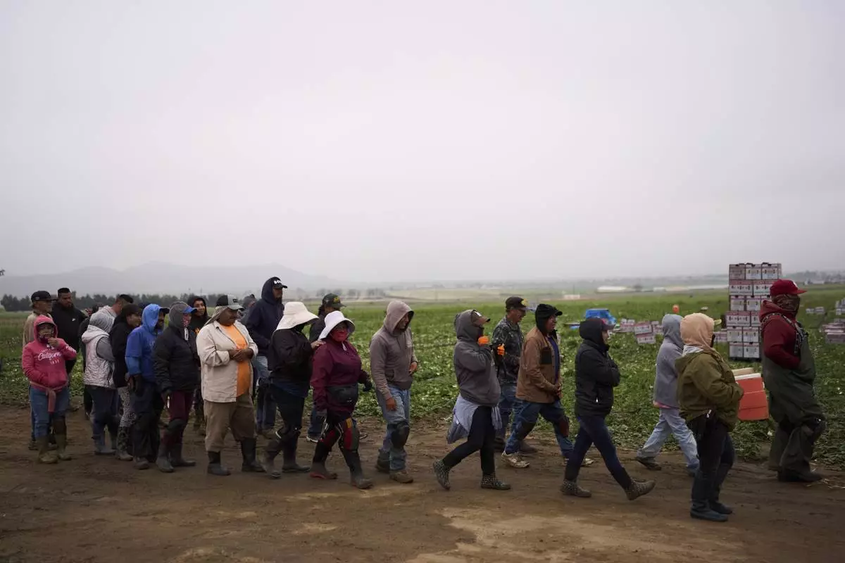 Workers gather for a Know Your Rights session hosted by immigrant and farmworker advocacy group TODEC in Lakeview, Calif., Tuesday, April 15, 2025. (AP Photo/Jae C. Hong)