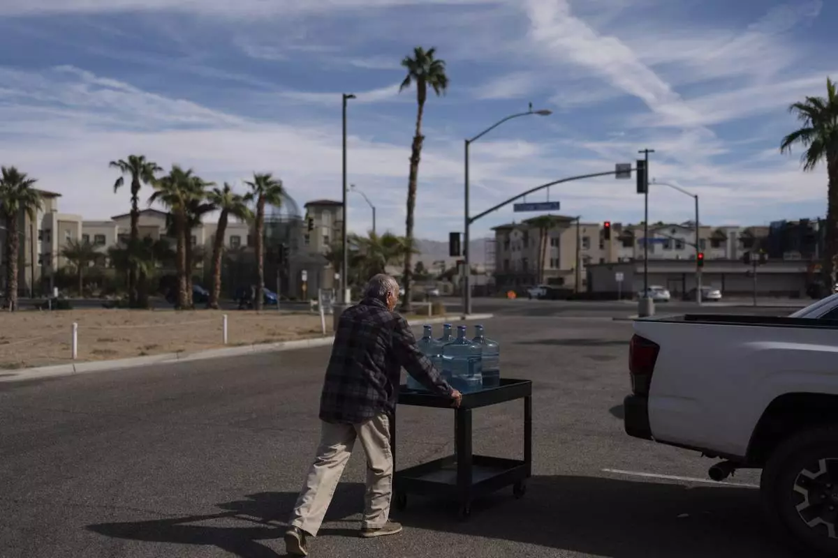Agustin Toledo, a mobile home resident in Southern California's eastern Coachella Valley, pushes a cart carrying refilled water jugs to his pickup truck in Coachella, Calif., Wednesday, Oct. 30, 2024. (AP Photo/Jae C. Hong)