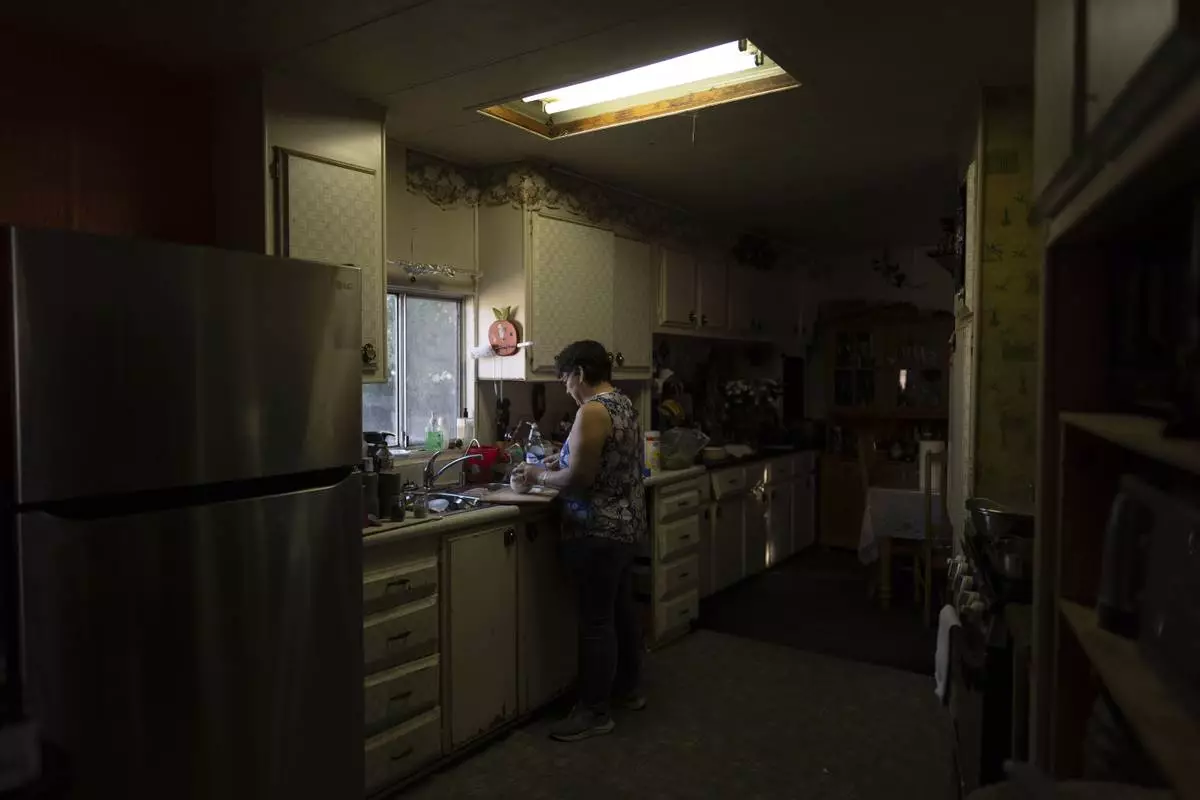 Maria de Jesus Galarza prepares dinner in her mobile home in Oasis, Calif., Wednesday, Oct. 30, 2024. (AP Photo/Jae C. Hong)