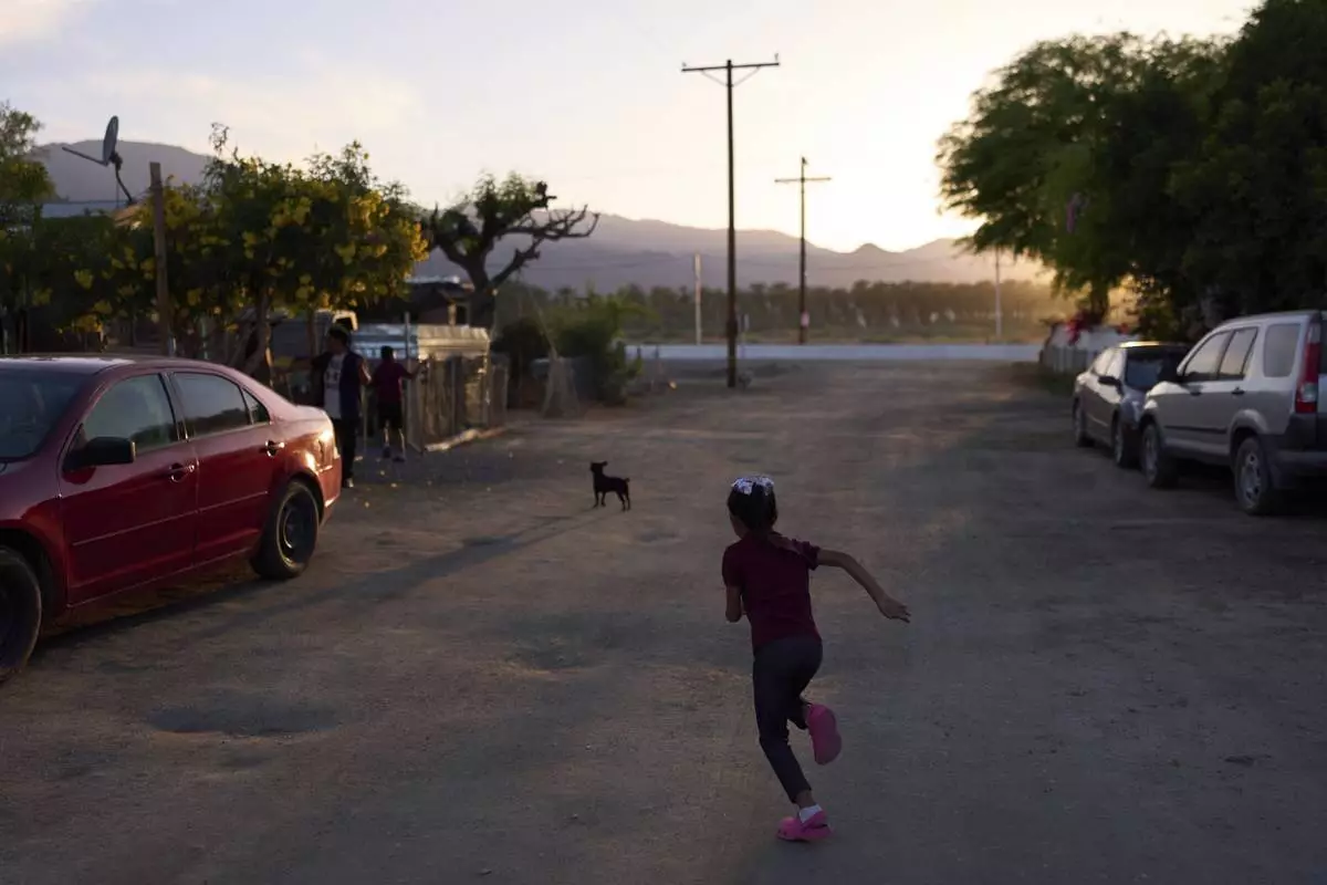 A girl runs across a dirt road in a mobile home park as the sun sets in Oasis, Calif., Monday, April 14, 2025. (AP Photo/Jae C. Hong)