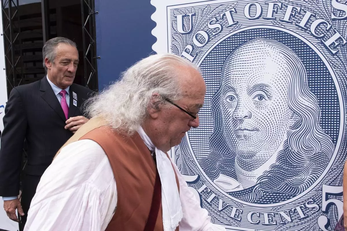FILE - Barry Stevens, portraying Benjamin Franklin, right, walks past a just unveiled stamp marking the 250th anniversary of the postal service, Wednesday, July 23, 2025, in Washington, as Postmaster General David Steiner looks on. (AP Photo/Cliff Owen, File)