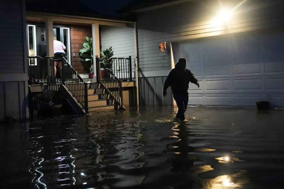 Haji Higa, right, and Lydia Heglin, left, walk through floodwaters at their front door after heavy rains led to historic flooding in the region Saturday, Dec. 13, 2025, in Burlington, Wash. (AP Photo/Lindsey Wasson)
