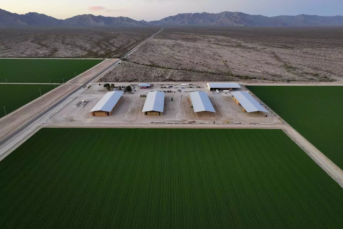 FILE - Bales of hay are stored under shelters at Al Dahra Farms, Tuesday, Oct. 17, 2023, in the McMullen Valley in Wenden, Ariz. (AP Photo/John Locher)