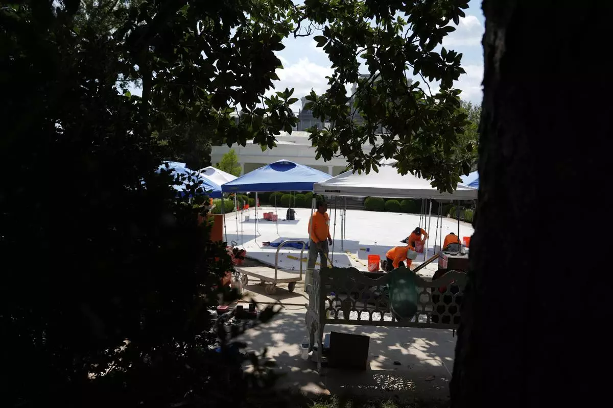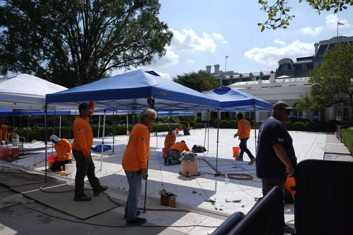 Construction work continues in the Rose Garden before President Donald Trump departs the White House, Thursday, July 24, 2025, in Washington. (AP Photo/Julia Demaree Nikhinson)
