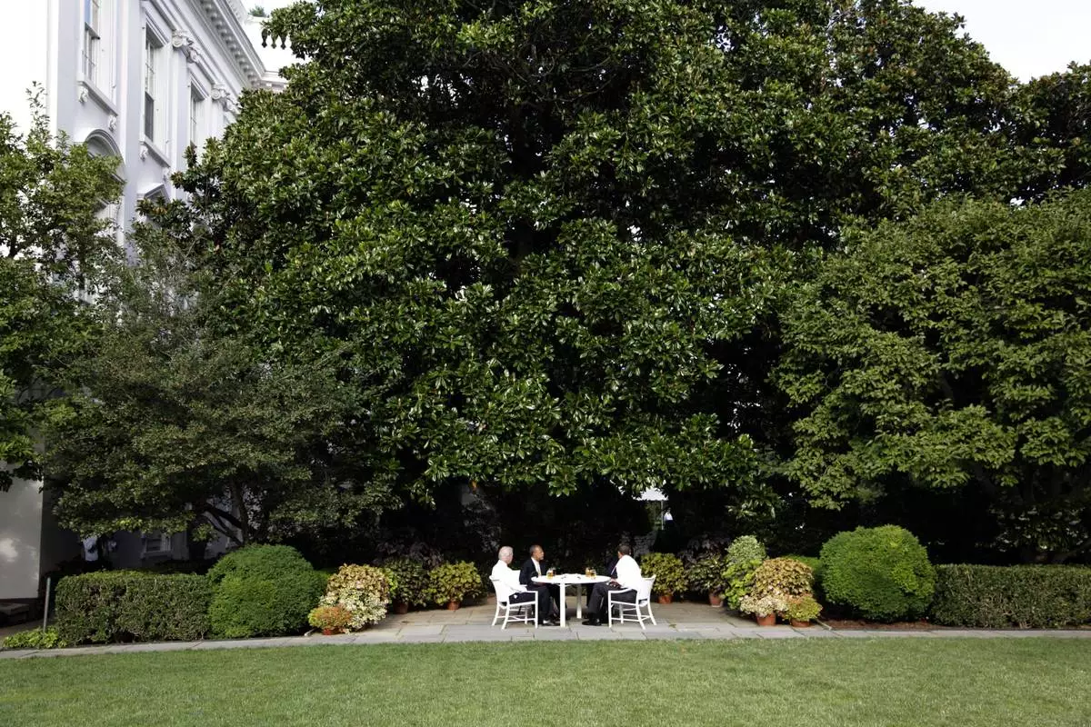FILE - President Barack Obama, right, and Vice President Joe Biden, left, have a beer with Harvard scholar Henry Louis Gates Jr., second from left, and Cambridge, Mass., police Sgt. James Crowley in the Rose Garden of The White House in Washington, July 30, 2009. (AP Photo/Alex Brandon, File)