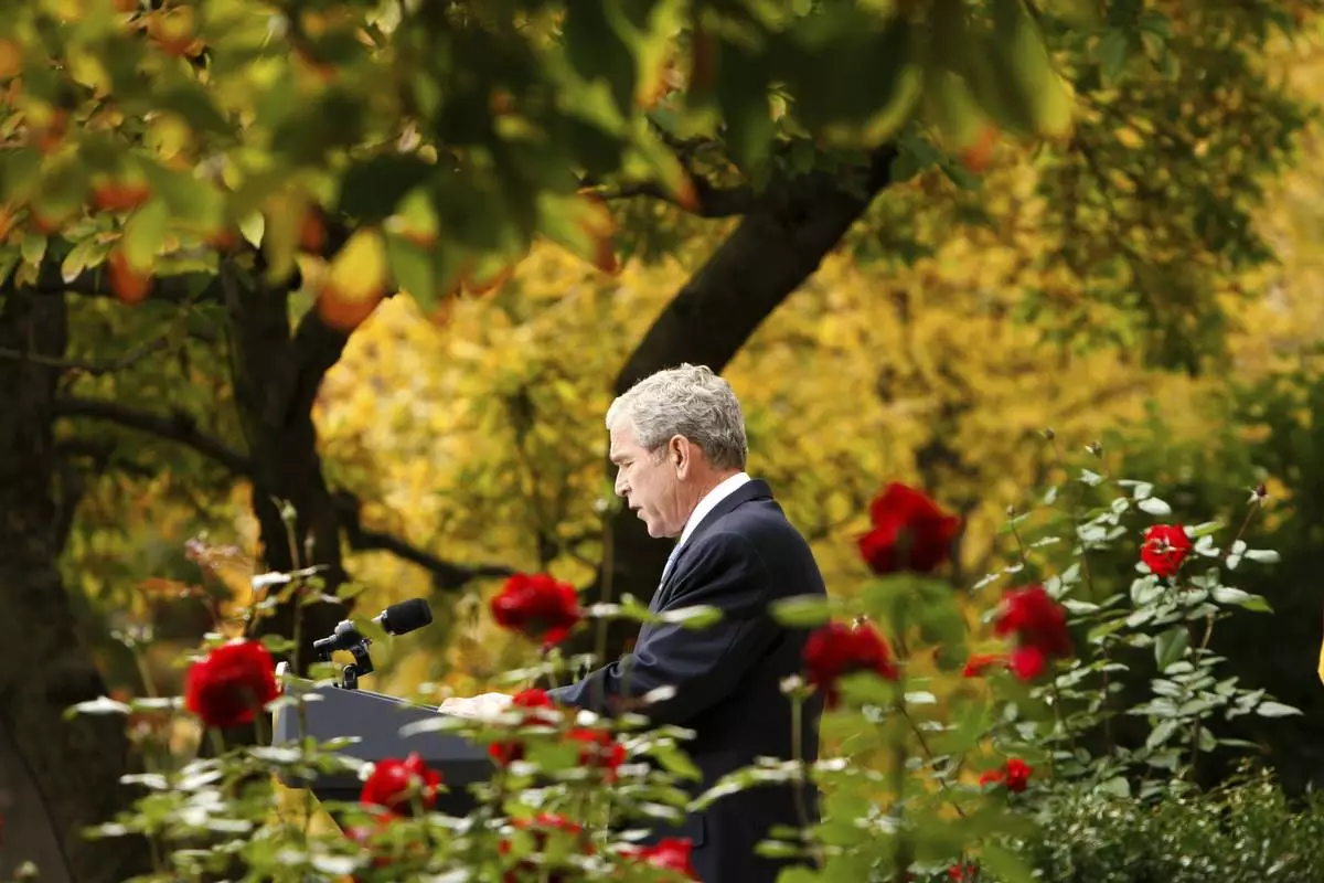 FILE - President George Bush makes a statement about the transition of the administration of President-elect Barack Obama, Nov. 5, 2008, in the Rose Garden of the White House in Washington. (AP Photo/Gerald Herbert, File)