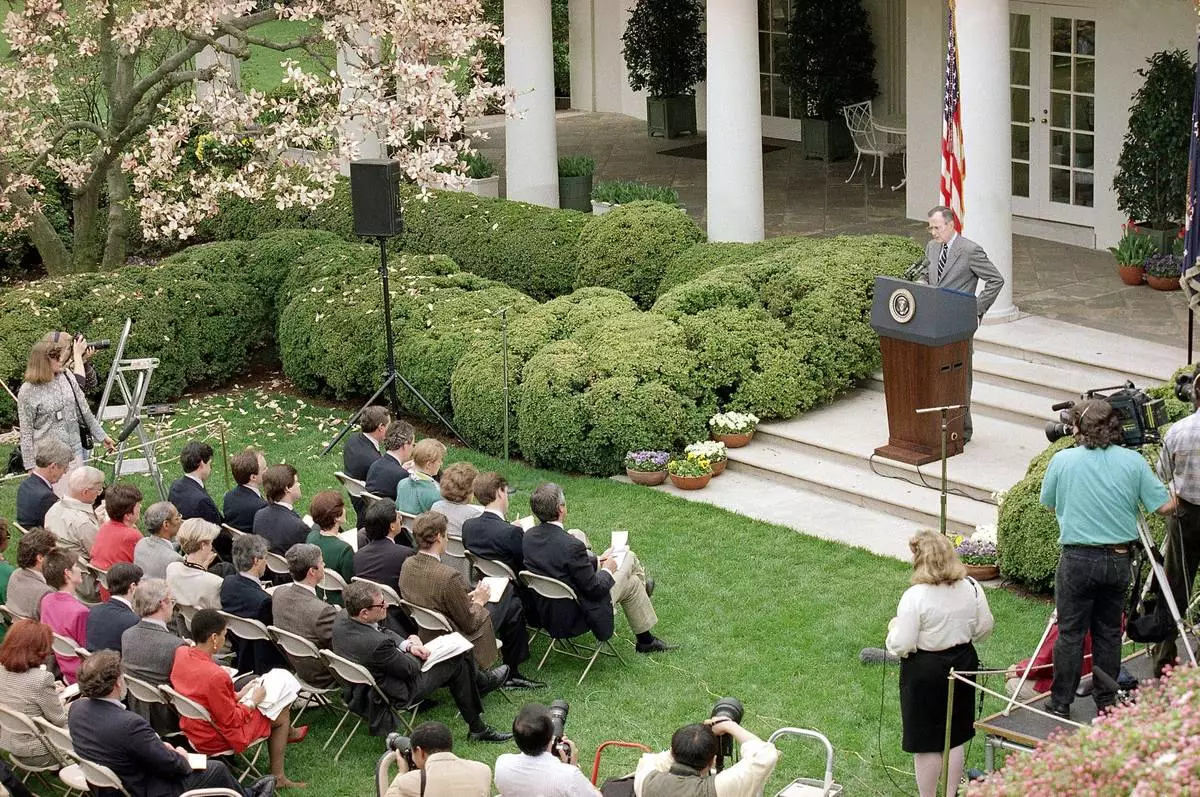 FILE - President George H. W. Bush holds an outdoor news conference in the Rose Garden of the White House in Washington, April 11, 1992. (AP Photo/Doug Mills, File)