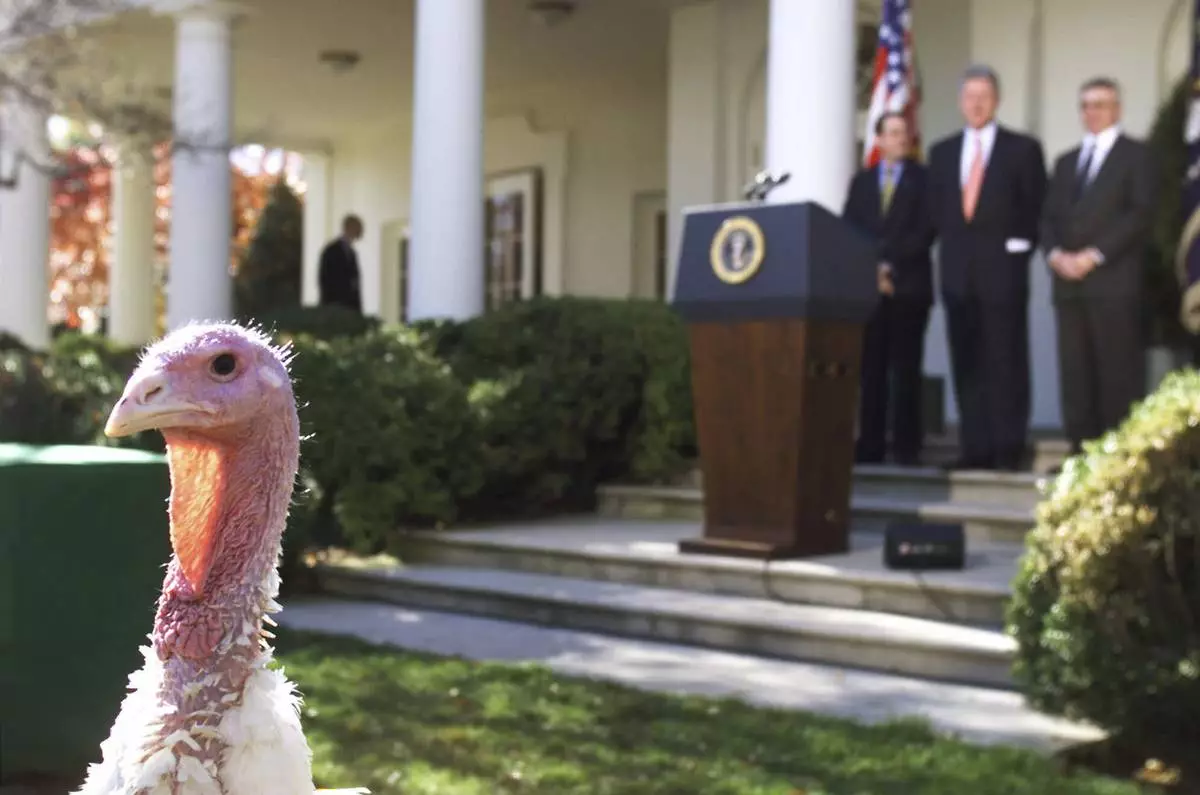 FILE - President Clinton, flanked by National Turkey Federation (NTF) Chairman Frank Gessell, left, and NTF Secretary Treasurer Jerry Jerome, watch a 45-pound turkey in the Rose Garden of the White House, Nov. 24, 1998 where the president, in a pre-Thanksgiving tradition, pardoned the bird. (AP Photo/Doug Mills, File)
