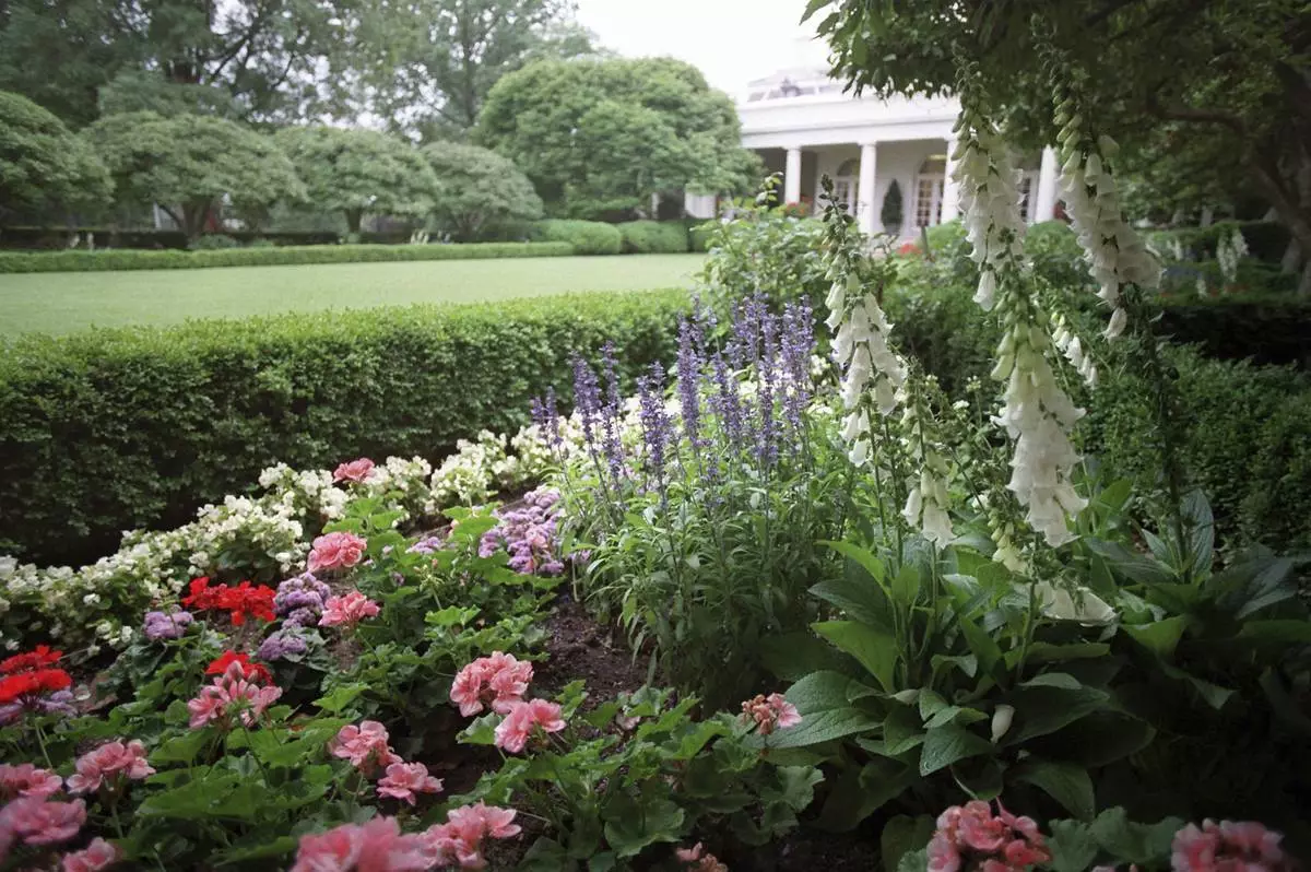 FILE - View of flowers in the Rose Garden of the White House, June 12, 1996, with the Oval Office in the background. (AP Photo/Ruth Fremson, File)