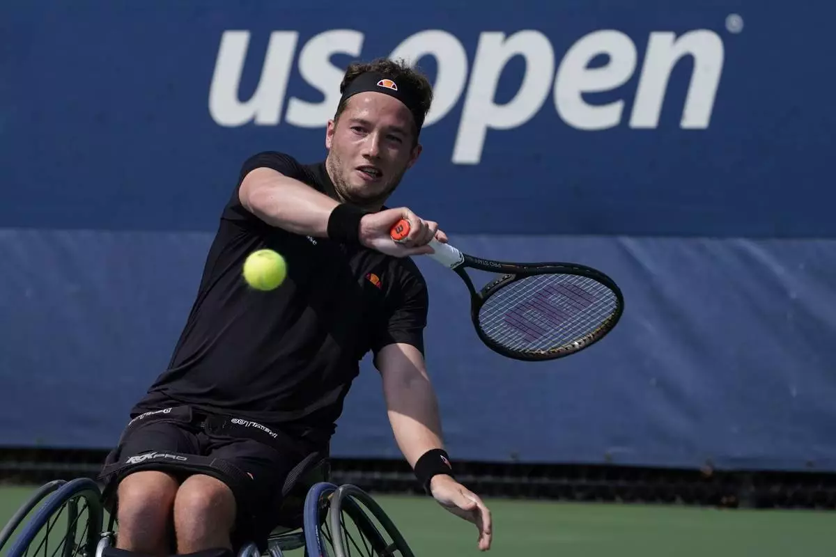 FILE - Alfie Hewett, of Britain, returns to Shingo Kunieda, of Japan, during the men's wheelchair singles final at the US Open tennis championships, Sunday, Sept. 12, 2021, in New York. (AP Photo/John Minchillo, File)
