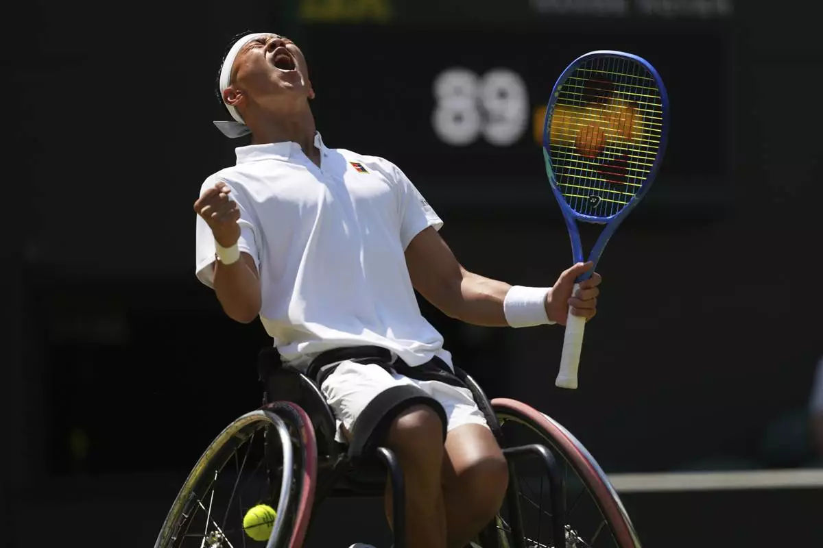FILE - Tokito Oda of Japan reacts during the men's wheelchair singles final match against Alfie Hewett of Britain at the Wimbledon Tennis Championships in London, Sunday, July 13, 2025.(AP Photo/Joanna Chan, File)