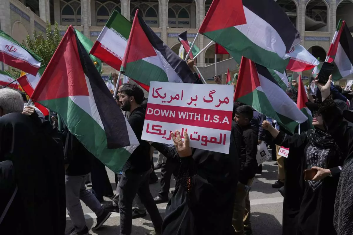 An Iranian worshipper holds up a placard as the others wave Iranian and Palestinian flags during an anti-Israeli and anti-U.S. protest after their Friday prayers in Tehran, Iran, Friday, July 25, 2025. (AP Photo/Vahid Salemi)