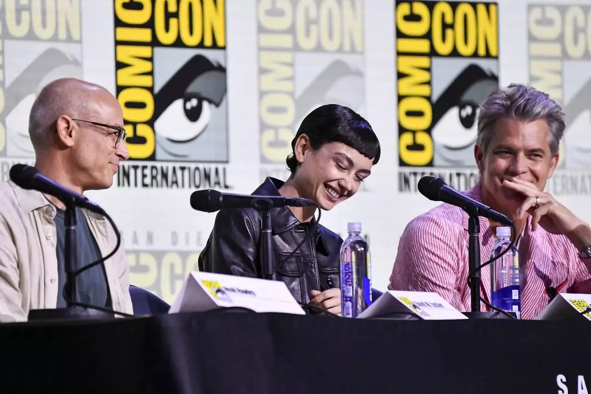 David W. Zucker, from left, Sydney Chandler, and Timothy Olyphant attend a panel for "Alien: Earth" during Comic-Con International on Friday, July 25, 2025, in San Diego. (Photo by Richard Shotwell/Invision/AP)