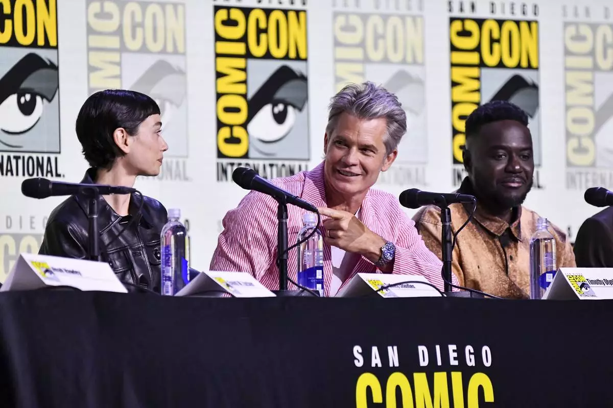 Sydney Chandler, from left, Timothy Olyphant, and Babou Ceesay attend a panel for "Alien: Earth" during Comic-Con International on Friday, July 25, 2025, in San Diego. (Photo by Richard Shotwell/Invision/AP)