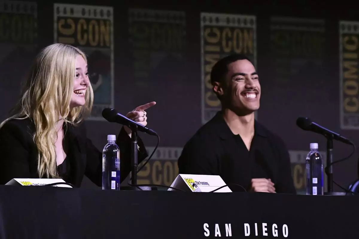 Elle Fanning, left, and Dimitrius Schuster-Koloamatangi attend a panel for "Predator: Badlands" during Comic-Con International on Friday, July 25, 2025, in San Diego. (Photo by Richard Shotwell/Invision/AP)