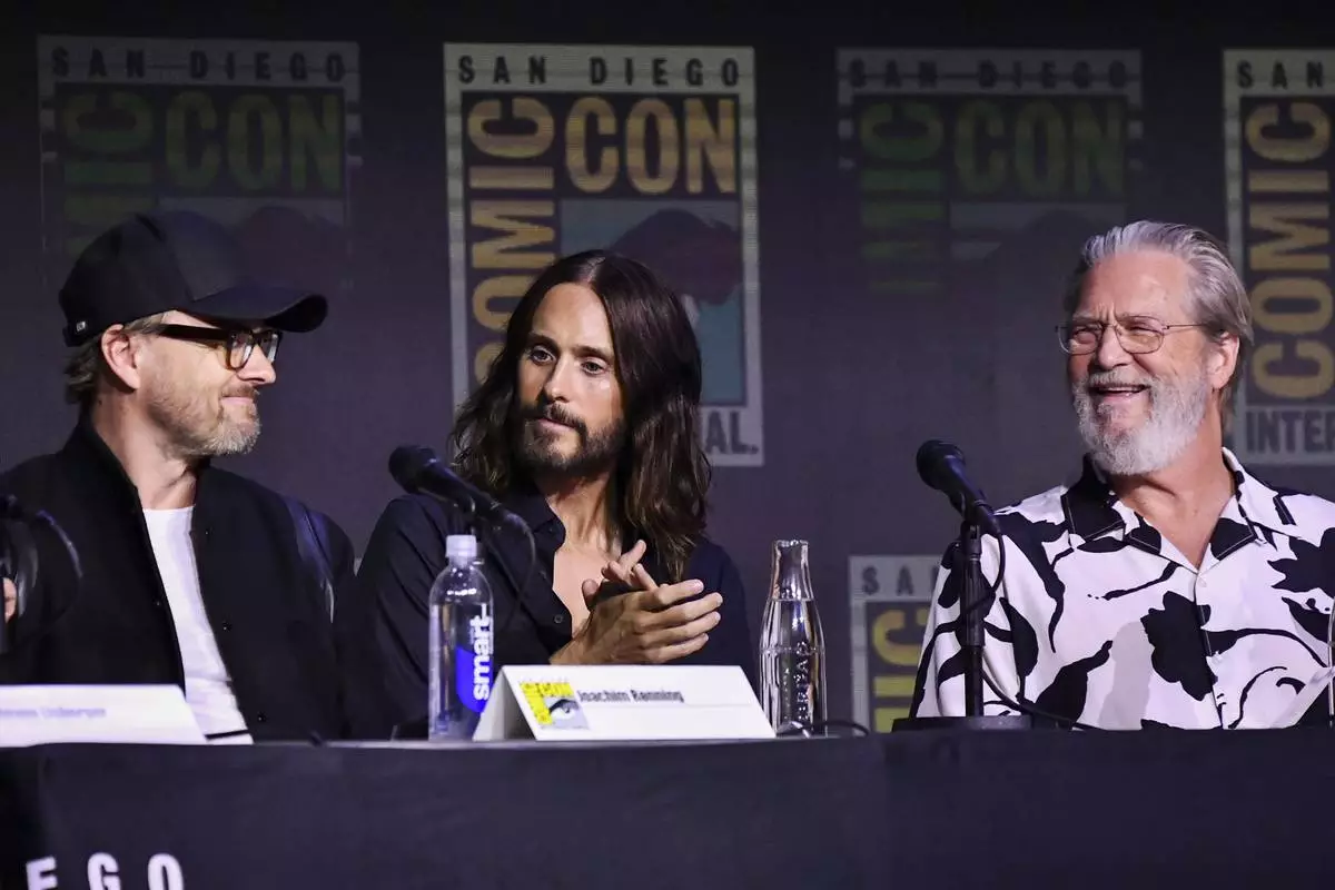 Joachim Ronning, from left, Jared Leto, and Jeff Bridges attend a panel for "Tron: Ares" during Comic-Con International on Friday, July 25, 2025, in San Diego. (Photo by Richard Shotwell/Invision/AP)