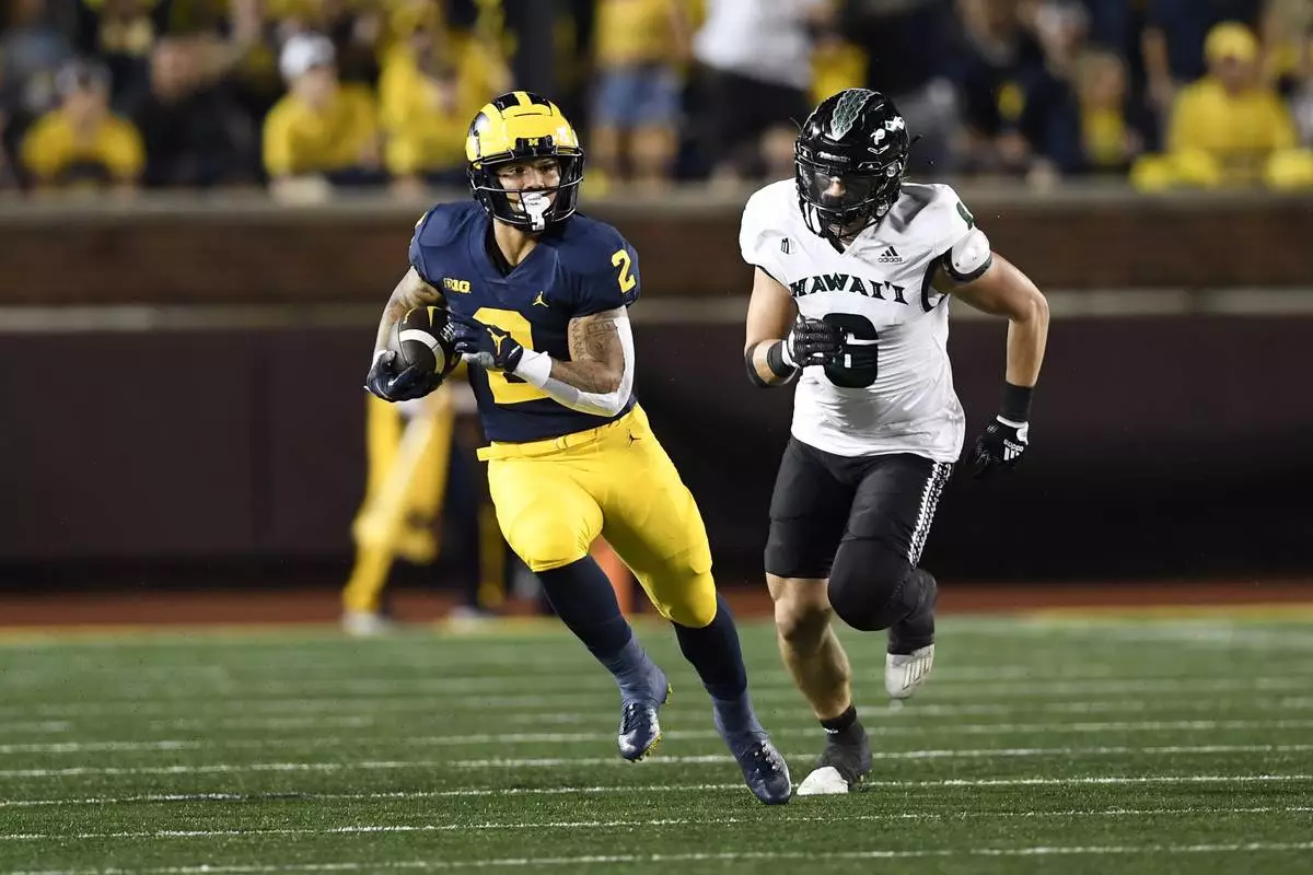 FILE - Michigan Wolverines running back Blake Corum, left, rushes as he is chased by Hawaii defensive back Riley Wilson during the first half of an NCAA college football game, Sept. 10, 2022, in Ann Arbor, Mich. (AP Photo/Jose Juarez, File)