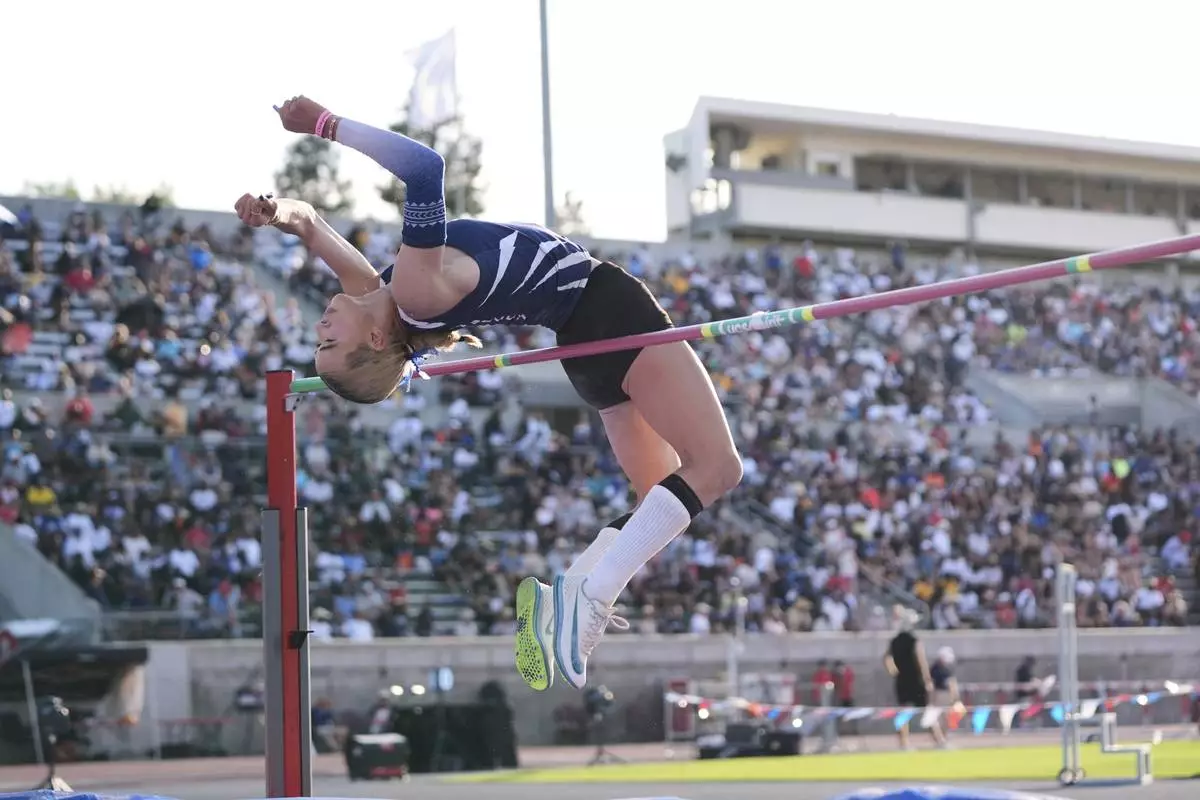 FILE - AB Hernandez, a transgender student at Jurupa Valley High School, competes in the high jump at the California high school track-and-field championships in Clovis, Calif., May 31, 2025. (AP Photo/Jae C. Hong, File)