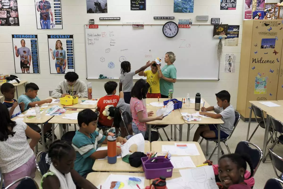 Jillian Murphy leads children in math activities during the East Providence Boys and Girls Club Summer Camp at Emma G. Whiteknact Elementary School on Thursday, July 10, 2025, in Providence R.I. (AP Photo/Sophie Park)
