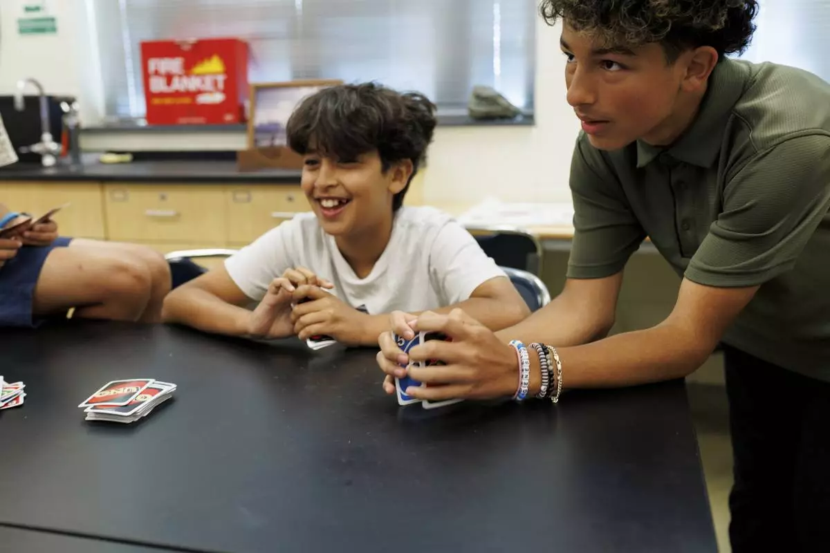 Attendees of LASOS summer camp play a game of Uno at Bel Air High School in Bel Air, Md., on Thursday, July 24, 2025. (AP Photo/KT Kanazawich)