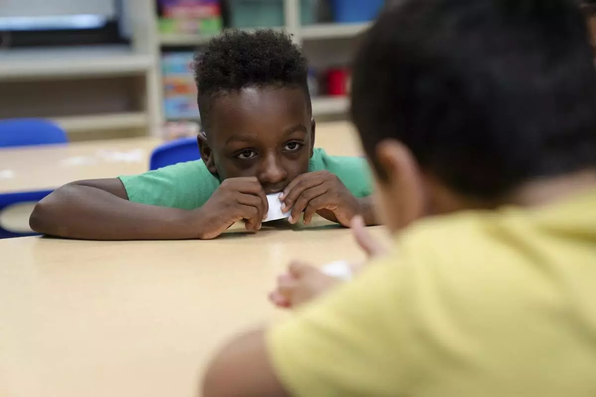 Kyro Sanchez, 7, participates in a science activity about pollinators during the East Providence Boys and Girls Club Summer Camp at Emma G. Whiteknact Elementary School on Thursday, July 10, 2025, in Providence, R.I. (AP Photo/Sophie Park)