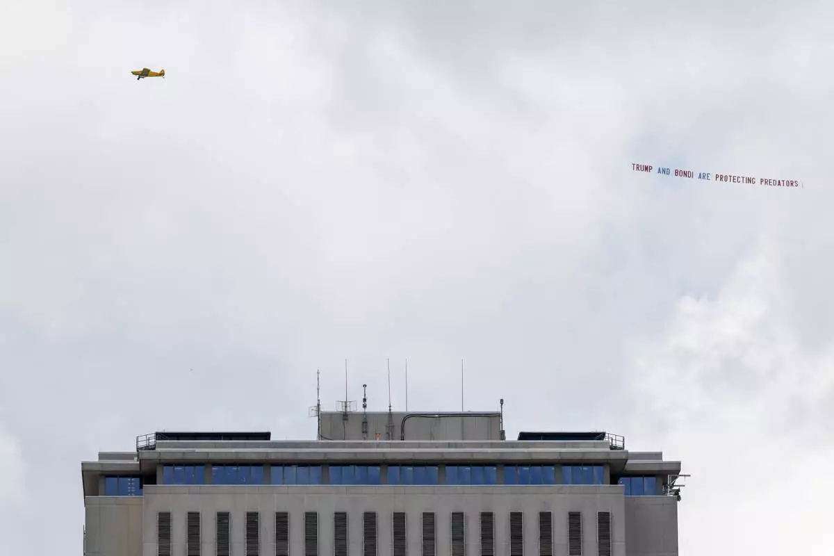 An airplane towing a banner that reads "Trump and Bondi are protecting predators" is seen over the Florida Capitol, Friday, July 25, 2025, in Tallahassee, Fla., as Deputy Attorney General Todd Blanche meets with Ghislaine Maxwell, the imprisoned former girlfriend of financier and convicted sex offender Jeffrey Epstein in the nearby federal courthouse. (AP Photo/Colin Hackley)