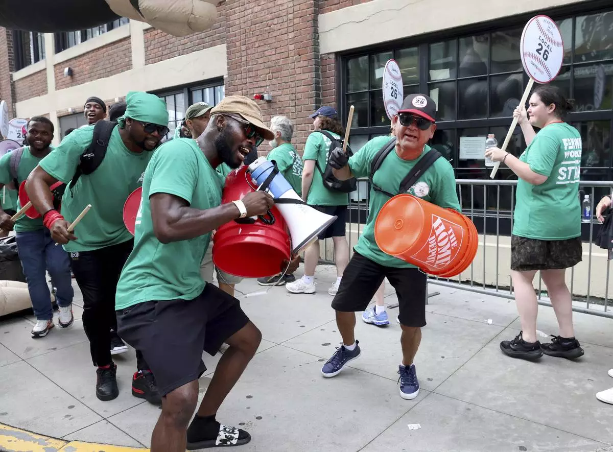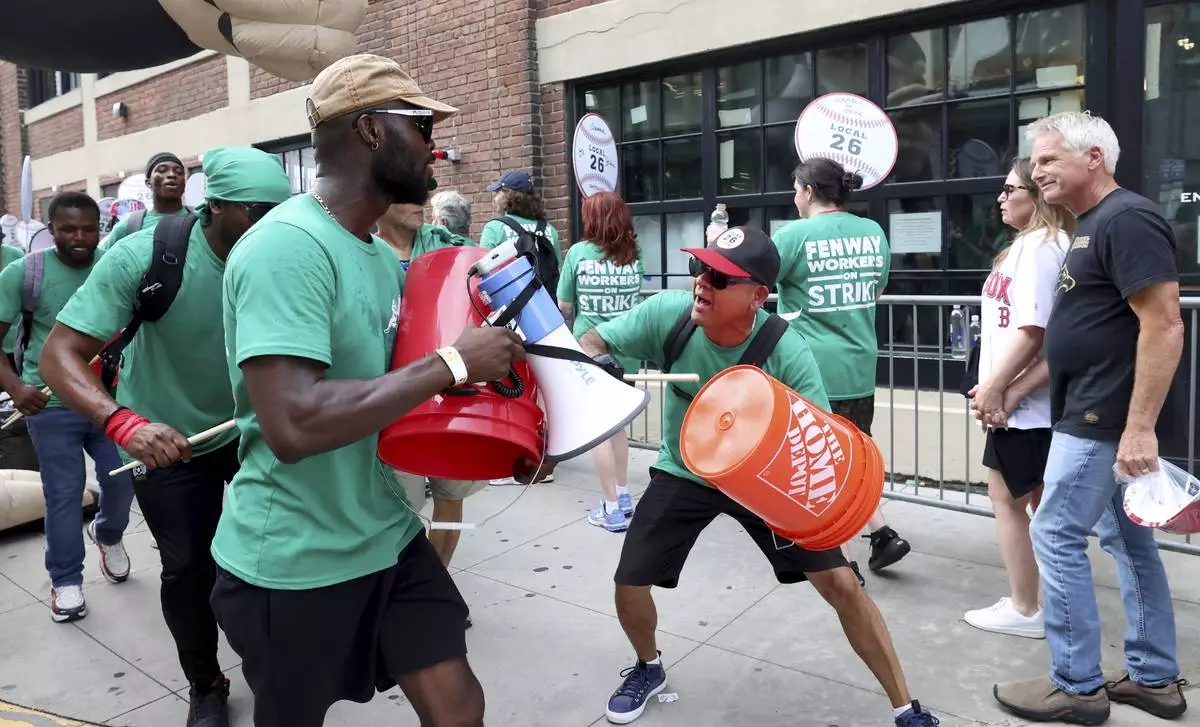 Concession workers from Fenway Park picket outside the ballpark Friday, July 25, 2025, in Boston before a baseball game between the Boston Red Sox and the Los Angeles Dodgers. (AP Photo/Mark Stockwell)