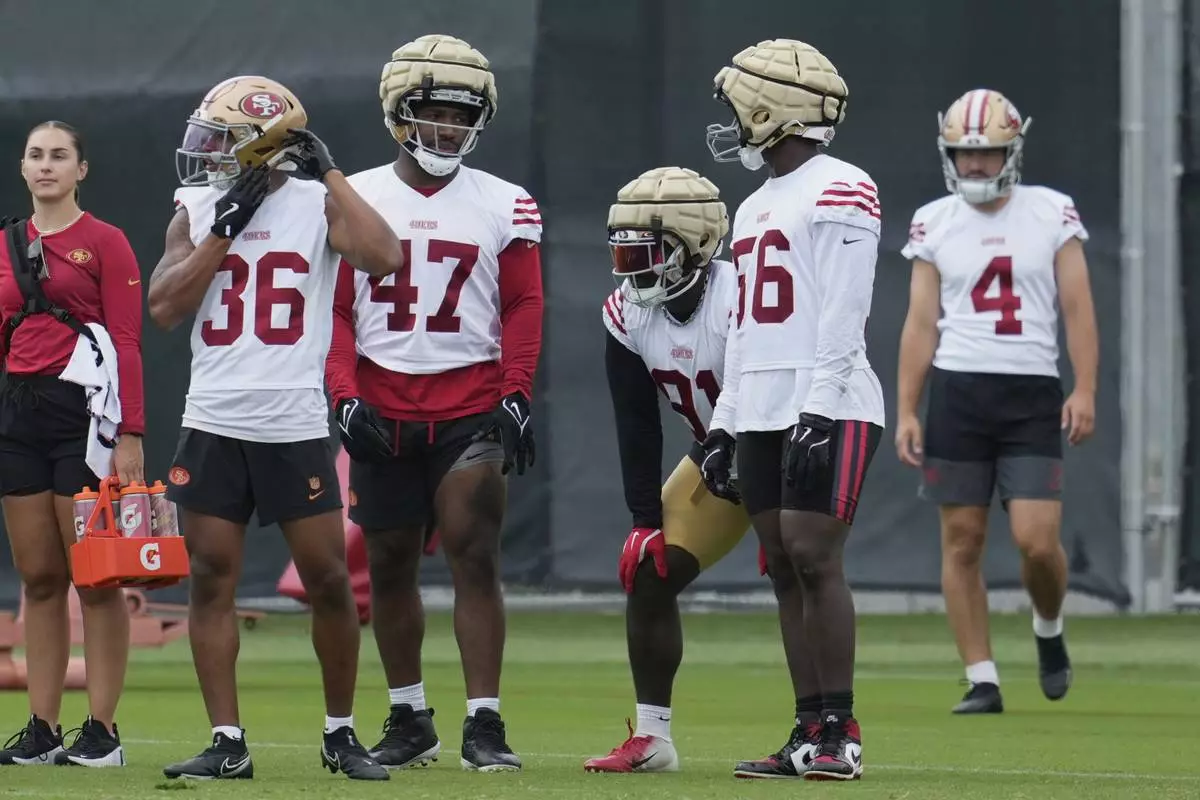 San Francisco 49ers safety Marques Sigle (36), defensive lineman Bryce Huff (47), defensive tackle Sam Okuayinonu, middle, defensive lineman Tarron Jackson (56) and place kicker Jake Moody (4) stand on the field during practice at the team's NFL football training camp, Thursday, July 24, 2025, in Santa Clara, Calif. (AP Photo/Jeff Chiu)