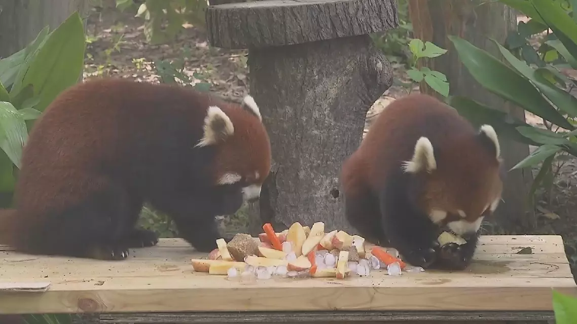 The breeders have also set up misting systems on the trees favored by red pandas for climbing. Additionally, they've crafted delightful treats, including apples, carrots, and ice-stuffed desserts, to keep the animals cool and entertained.