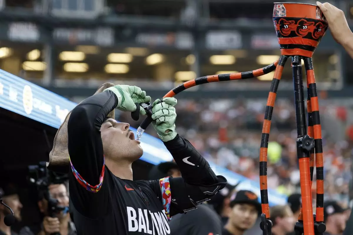 Baltimore Orioles' Alex Jackson drinks from the homer hose in the dugout after hitting a home run off Colorado Rockies pitcher Kyle Freeland during the second inning of a baseball game in Baltimore, Friday, July 25, 2025. (AP Photo/Terrance Williams)
