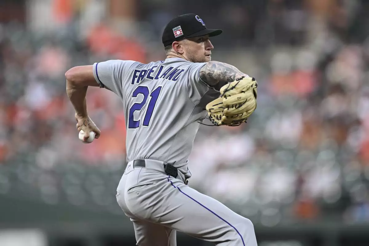 Colorado Rockies pitcher Kyle Freeland throws during the first inning of a baseball game against the Baltimore Orioles in Baltimore, Friday, July 25, 2025. (AP Photo/Terrance Williams)