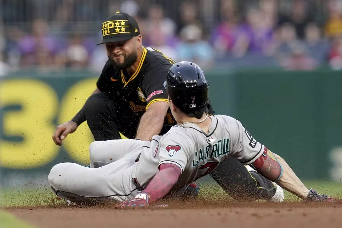 Arizona Diamondbacks' Corbin Carroll, bottom, is tagged out by Pittsburgh Pirates shortstop Isiah Kiner-Falefa, top, while trying to stretch a single into a double during the sixth inning of a baseball game, Friday, July 25, 2025, in Pittsburgh. (AP Photo/Matt Freed)