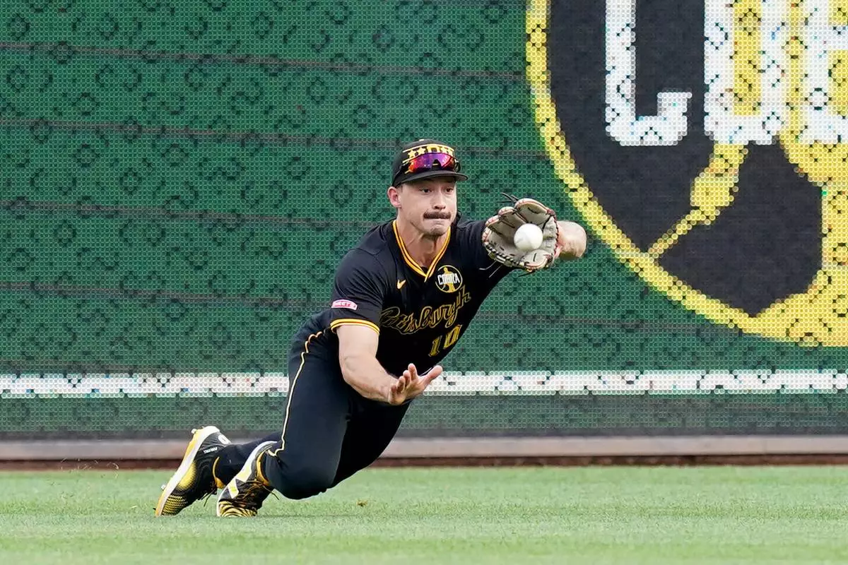 Pittsburgh Pirates right fielder Bryan Reynolds catches a line drive hit by Arizona Diamondbacks' Corbin Carroll during the first inning of a baseball game, Friday, July 25, 2025, in Pittsburgh. (AP Photo/Matt Freed)