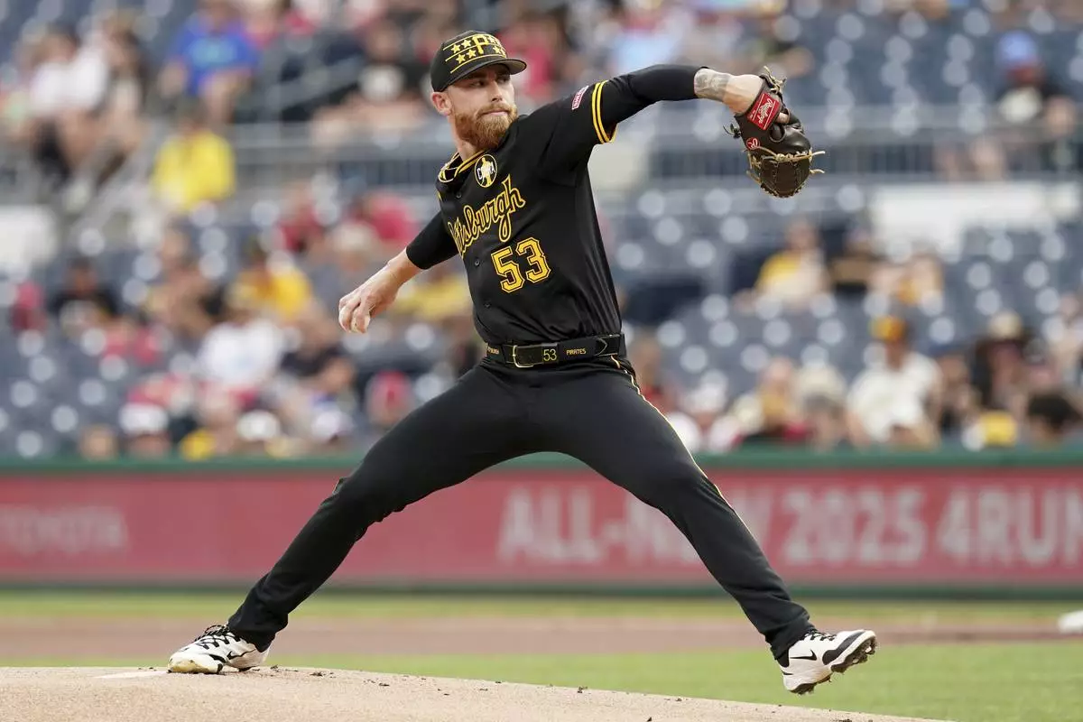 Pittsburgh Pirates pitcher Mike Burrows delivers during the first inning of a baseball game against the Arizona Diamondbacks, Friday, July 25, 2025, in Pittsburgh. (AP Photo/Matt Freed)