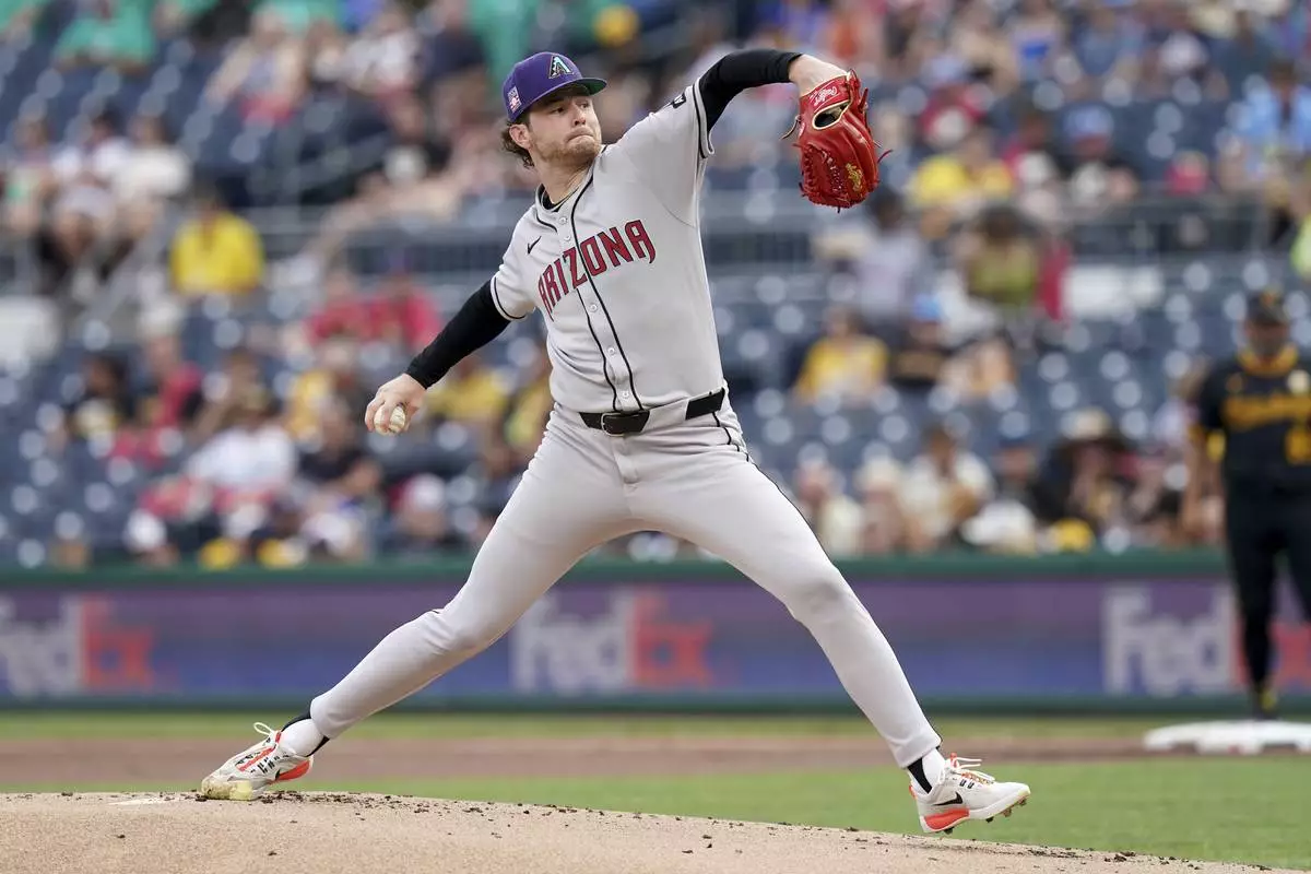 Arizona Diamondbacks pitcher Ryne Nelson delivers during the first inning of a baseball game against the Pittsburgh Pirates, Friday, July 25, 2025, in Pittsburgh. (AP Photo/Matt Freed)