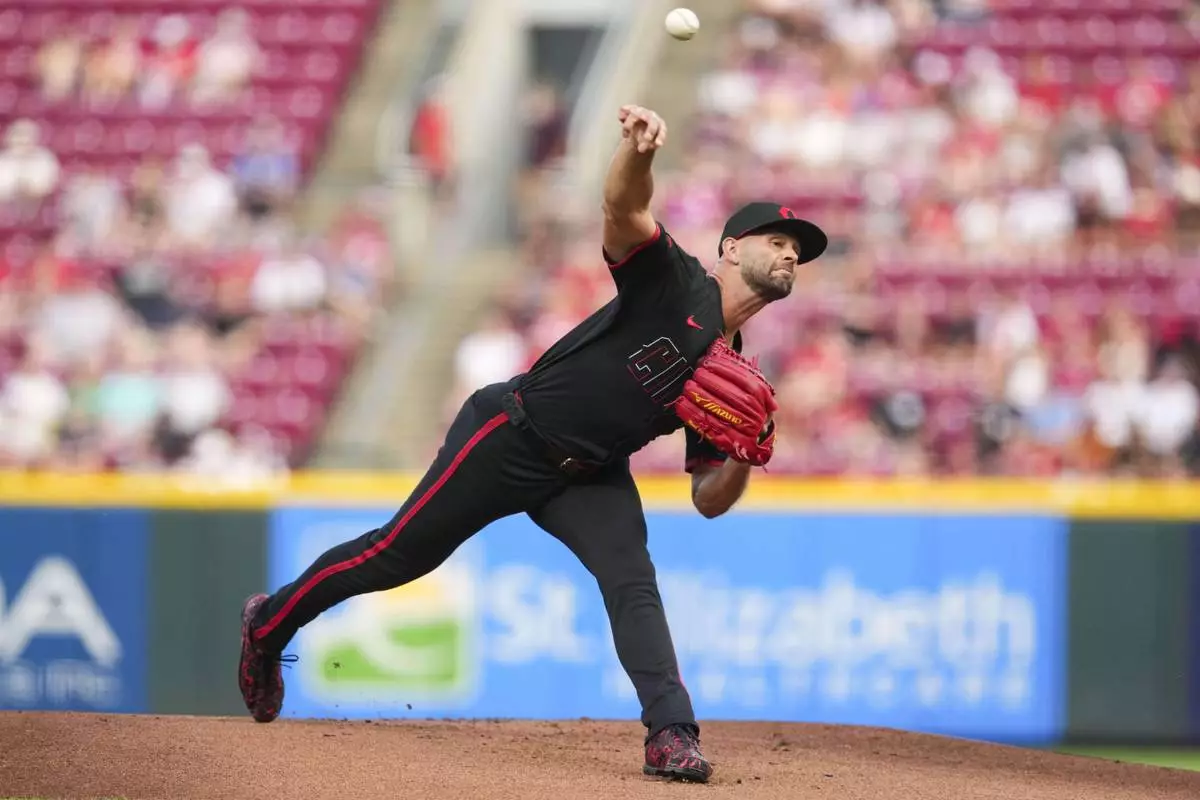 Cincinnati Reds pitcher Nick Martinez throws during the first inning of a baseball game against the Tampa Bay Rays, Friday, July 25, 2025, in Cincinnati. (AP Photo/Jeff Dean)