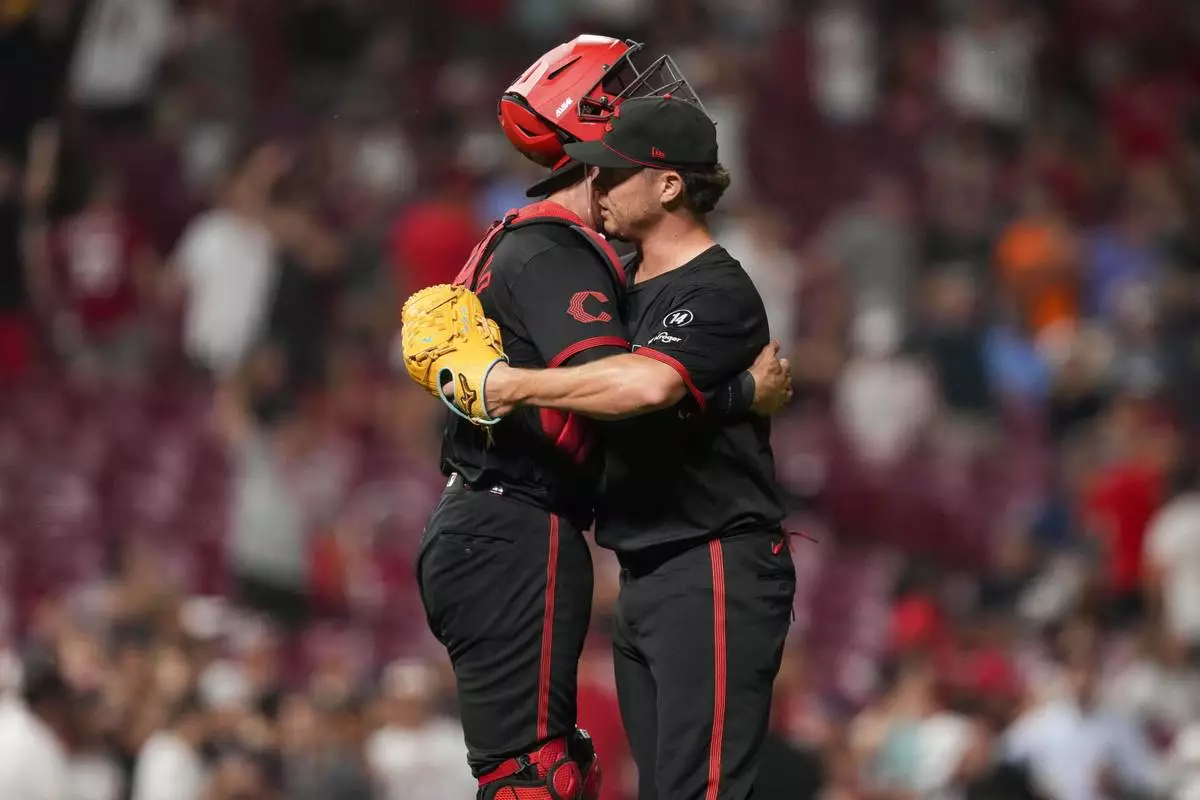 Cincinnati Reds' Emilio Pagán, right, celebrates with teammate Tyler Stephenson following a baseball game against the Tampa Bay Rays, Friday, July 25, 2025, in Cincinnati. (AP Photo/Jeff Dean)