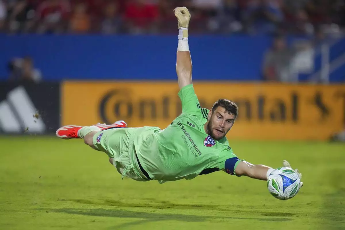 FC Dallas goalkeeper Maarten Paes makes a diving stop on a shot by New York City FC during the second half of an MLS soccer match Friday, July 25, 2025, in Frisco, Texas. (AP Photo/Julio Cortez)