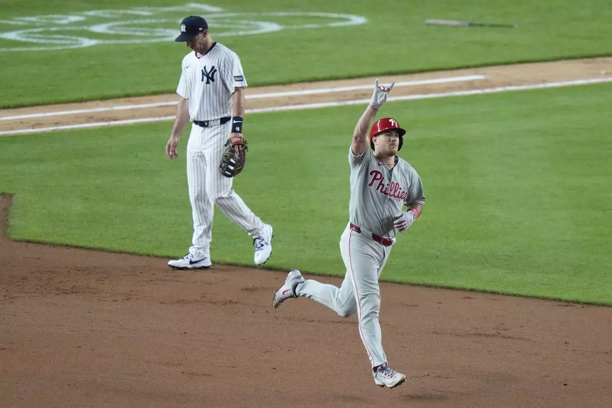 Philadelphia Phillies' J.T. Realmuto, right, runs past New York Yankees Paul Goldschmidt as he runs the bases after hitting a three-run home run during the seventh inning of a baseball game Friday, July 25, 2025, in New York. (AP Photo/Frank Franklin II)