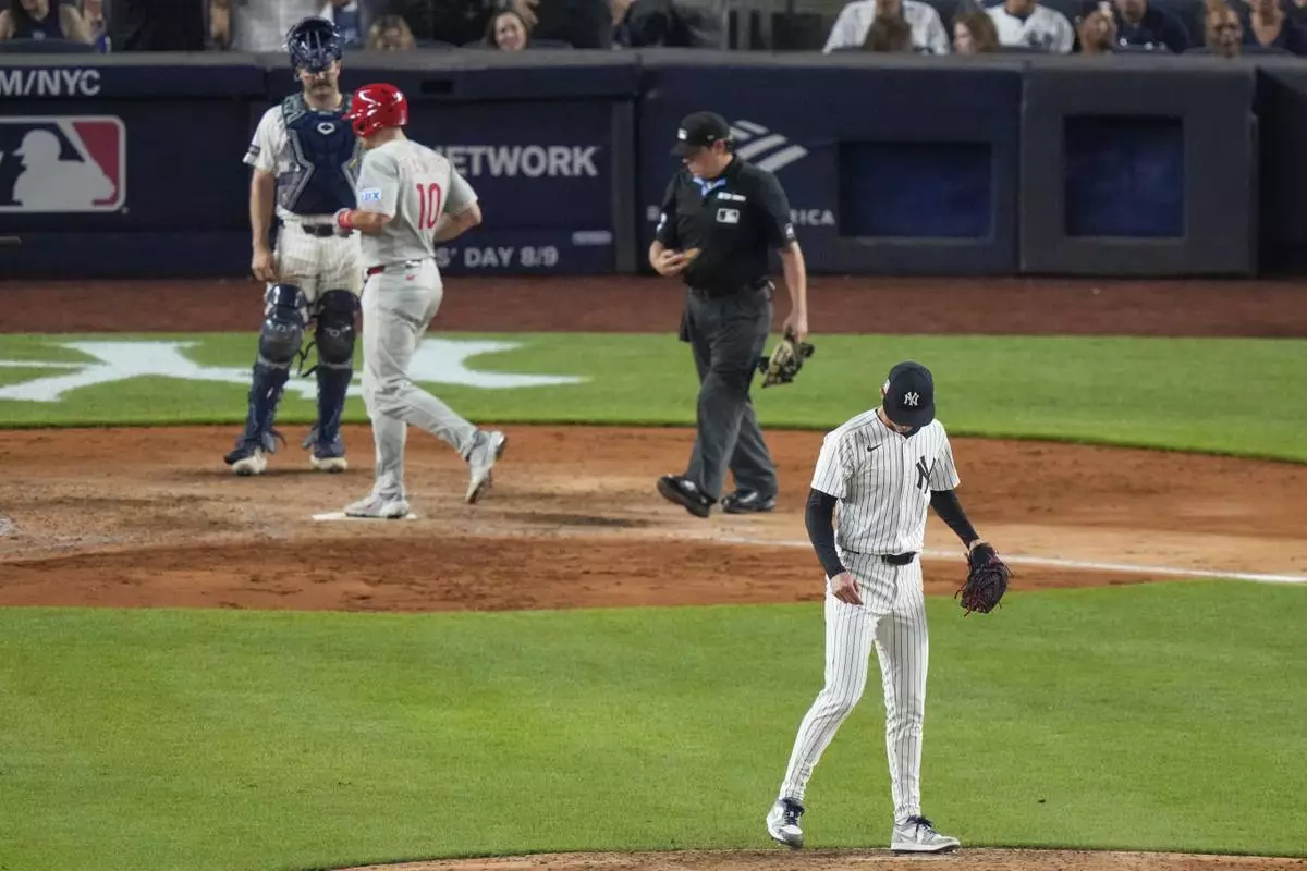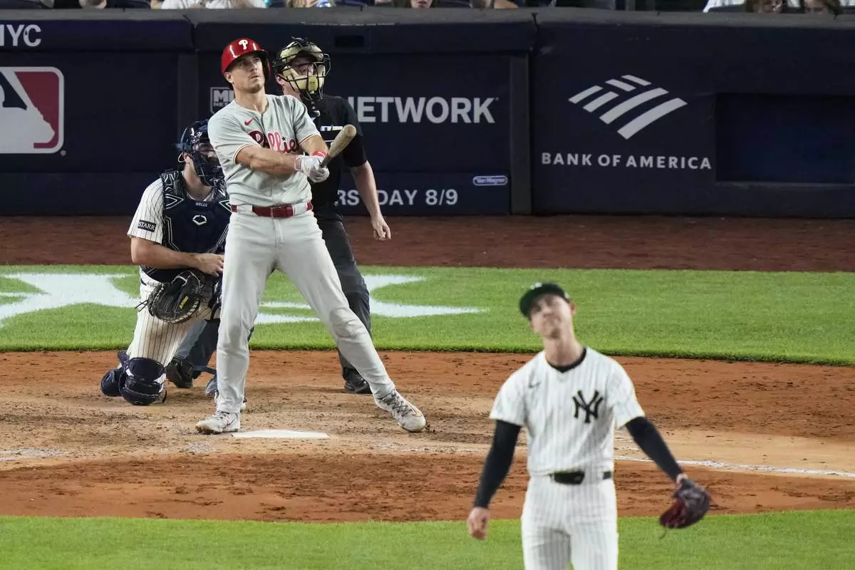 With Turner on third and Kyle Schwarber on second, Castellanos hit a 42-foot grounder at 61.4 mph to Goldschmidt, who was playing in. At the edge of the grass, Goldschmidt moved to his right, made an off-balance throw and the ball sailed over catcher Austin Wells’ glove as Turner scored the tying run, Schwarber took third and Castellanos second.