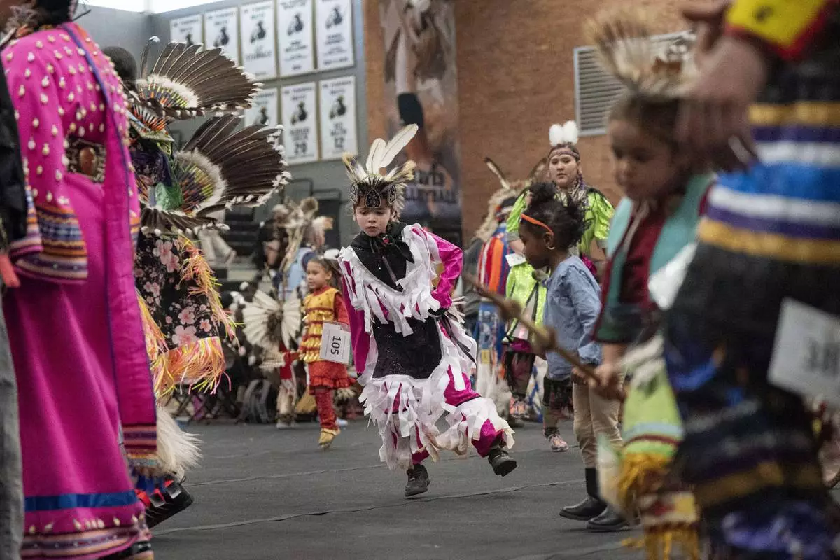 FILE - Members of the Lumbee Tribe participate during the BraveNation Powwow and Gather at UNC Pembroke, Saturday, March 22, 2025, in Pembroke, N.C. (AP Photo/Allison Joyce, file)