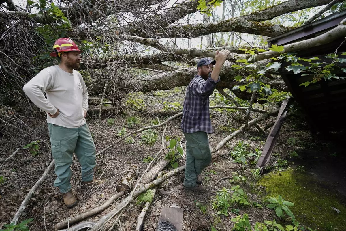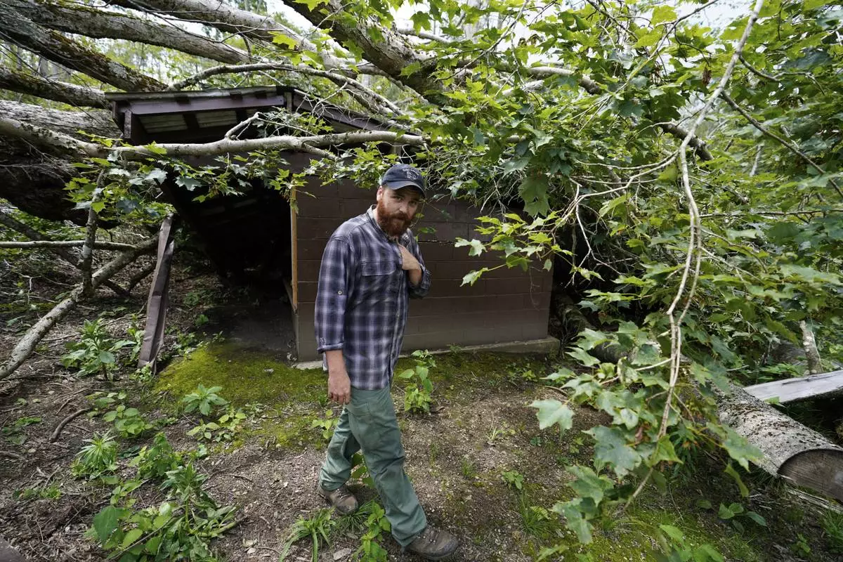 Fallen trees are seen near the Cherry Gap Shelter along the Appalachian Trail, July 22, 2025, in Unicoi, Tenn. (AP Photo/Erik Verduzco)