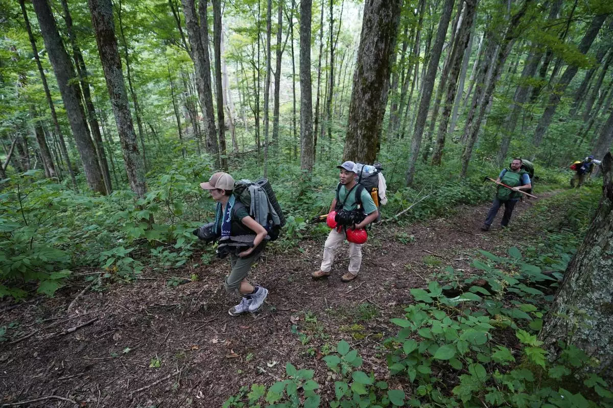 Volunteers Kumi Aizawa, from left, Shin Hasegawa, and Patrick Wilsey, walk to their camp site near the Cherry Gap Shelter along the Appalachian Trail during a trail rebuilding project, July 22, 2025, in Unicoi, Tenn. (AP Photo/Erik Verduzco)