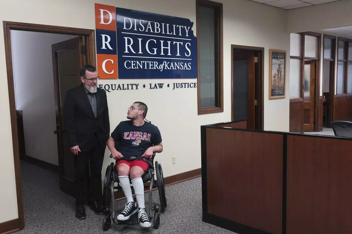 Rocky Nichols, left, executive director of the Disability Rights Center of Kansas, and Matthew Hull, right, a Kansas resident who has cerebral palsy, speak at the center in Topeka, Kans., June 18, 2025. (AP Photo/John Hanna)