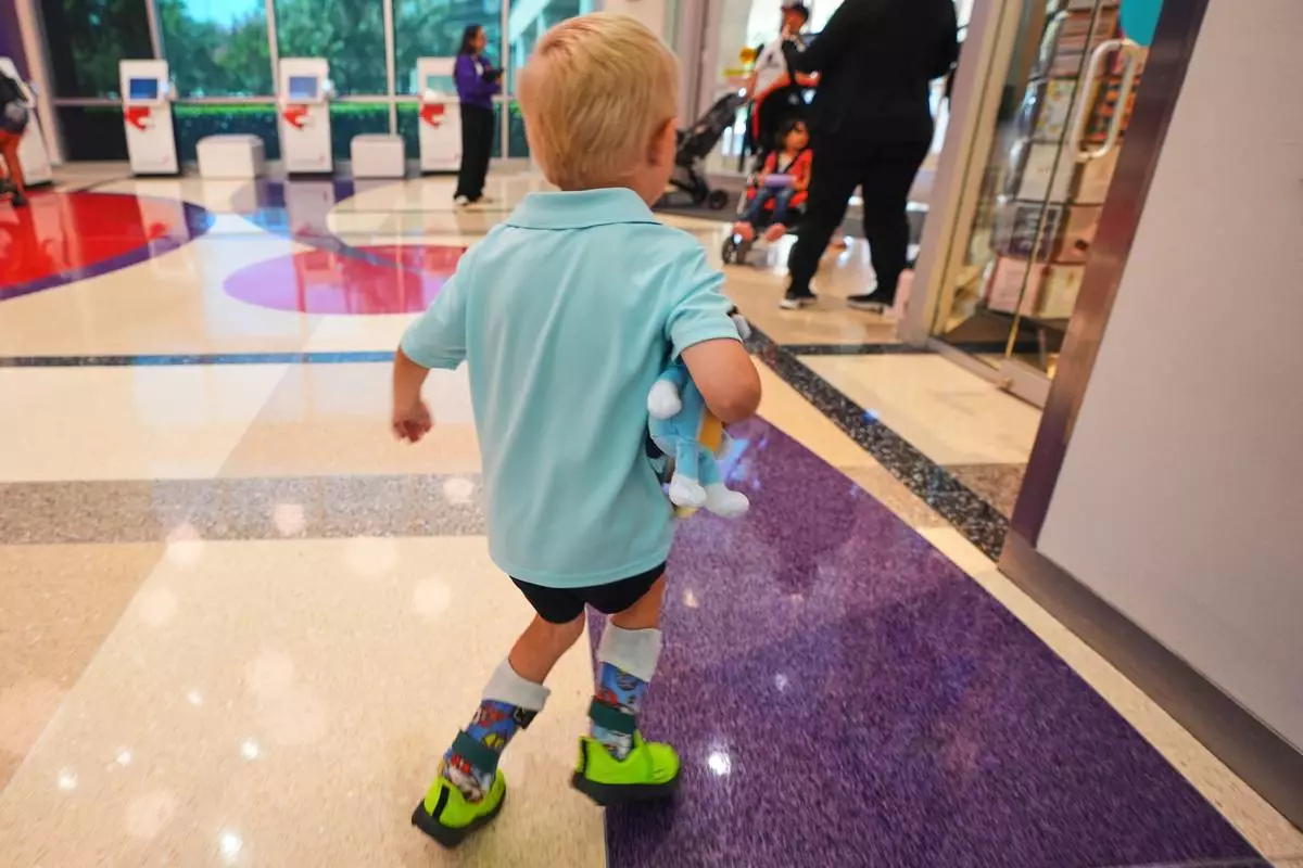 Four-year-old Rustin 'Rusty' Haugh who suffers from Combined Oxidative Phosphorylation Deficiency 11, or COXPD11, walks in a hospital lobby after a doctor's appointment in Dallas, Wednesday, July 23, 2025. (AP Photo/LM Otero)