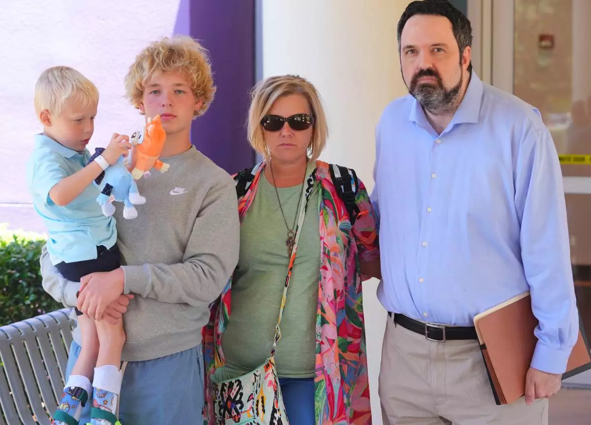 Attorney Chris McGreal, right, poses for a photo with Jessica Haugh, center right, and her sons Ryder Ponder, 14, center left, and Rustin 'Rusty' Haugh, 4, after a doctor's appointment for Rusty in Dallas, Wednesday, July 23, 2025. (AP Photo/LM Otero)