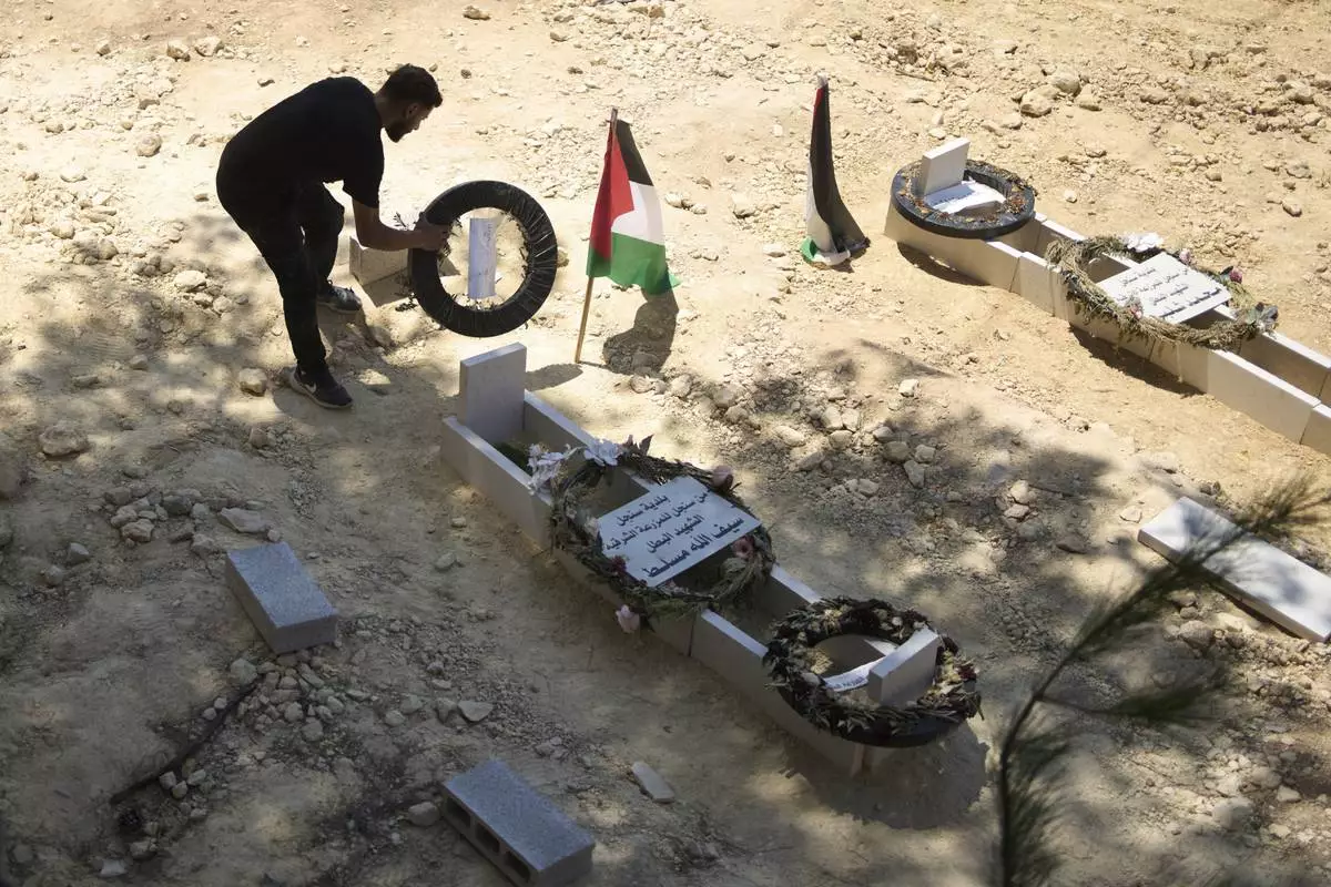 On Monday, July 21, 2025, a man tidies the graves of Palestinian-American Sayfollah Musallet, left, and Mohammed al-Shalabi, both of whom were killed by Israeli settlers in the West Bank town of Al Mazra as-Sharqiya. (AP Photo/Maya Alleruzzo)