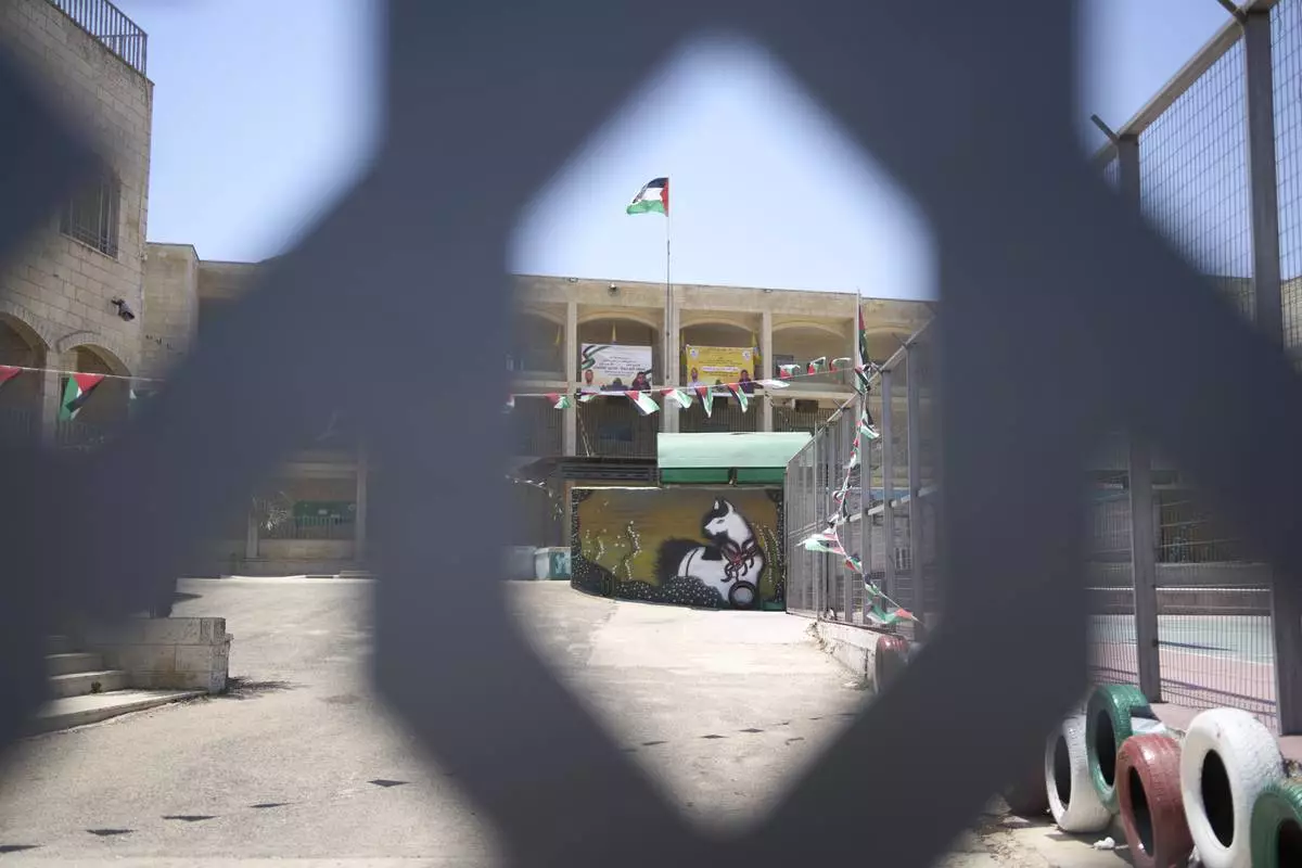 Memorial banners for Palestinian-American Sayfollah Musallet and Mohammed al-Shalabi, both killed by Israeli settlers, are displayed at a school in the West Bank town of Al Mazra as-Sharqiya, Monday, July 21, 2025. (AP Photo/Maya Alleruzzo)