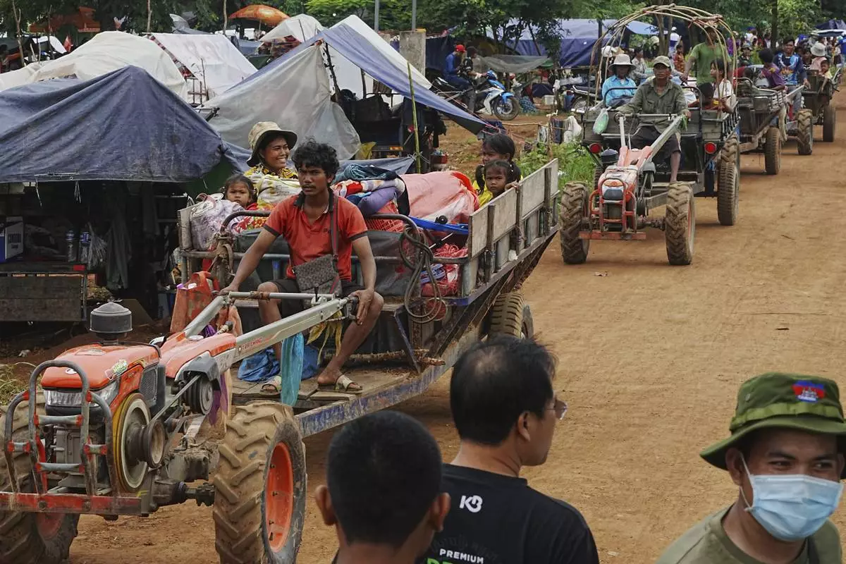 Cambodians sit on a cart of tractor as they take refuge in Batthkoa primary school in Oddar Meanchey province, Cambodia, Saturday, July 26, 2025, as border fighting between Thailand and Cambodia entered its third day. (AP Photo/Heng Sinith)